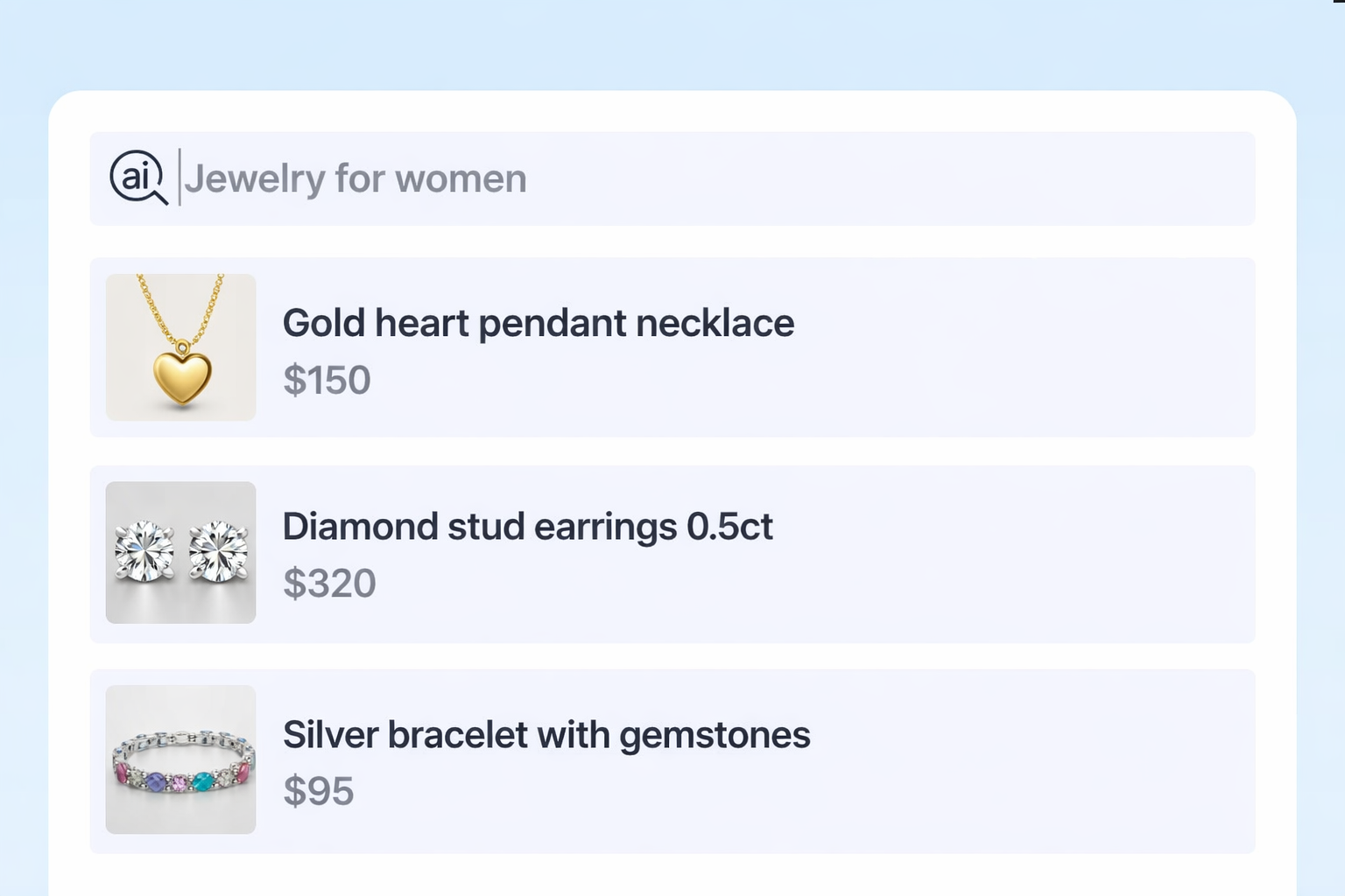 AI-powered product search for jewelry stores and marketplaces based on natural language queries, metal type, gemstone, cut, setting, occasion, style, and budget — helping shoppers quickly find the right pieces with less friction.