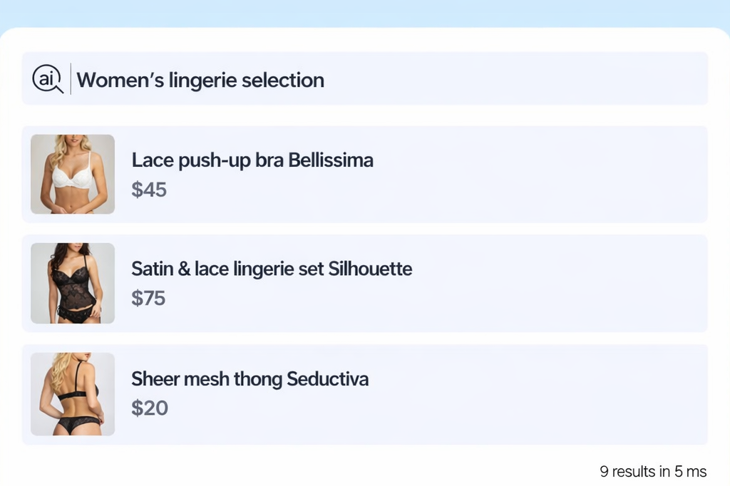 AI-powered search for lingerie and swimwear stores and marketplaces that helps shoppers find the right pieces by fabric, detail, fit, size, brand, color, and matching set logic.